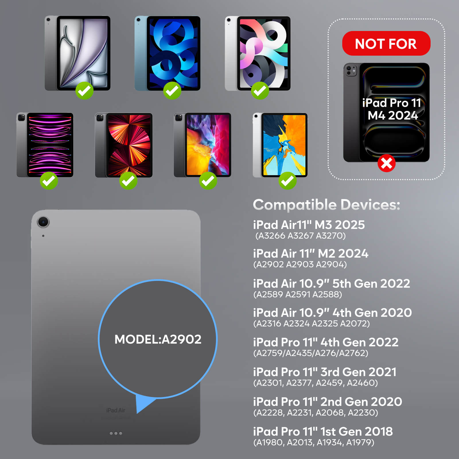 - Keyboard case for iPad Air 11-inch (M3) 2025 (model number: A3266 A3267 A3270)/iPad Air 11-inch M2 2024 (A2902/A2903/A2904) / iPad Air 5th Generation 10.9 Inch 2022 (A2589 A2591 A2588) / iPad Air 4th Gen 10.9 Inch 2020 (A2316/A2324/A2325/A2072); iPad pro 11" 4th Gen 2022(A2759/A2435/A276/A2762); iPad Pro 11" 3rd Gen 2021 (A2301/A2377/A2459/A2460); iPad Pro 11" 2nd Gen 2020 (A2228/A2231/A2068/A2230) and iPad Pro 11" 2018 (Models: A1980, A2013, A1934, A1979). Not compatible with any other devices