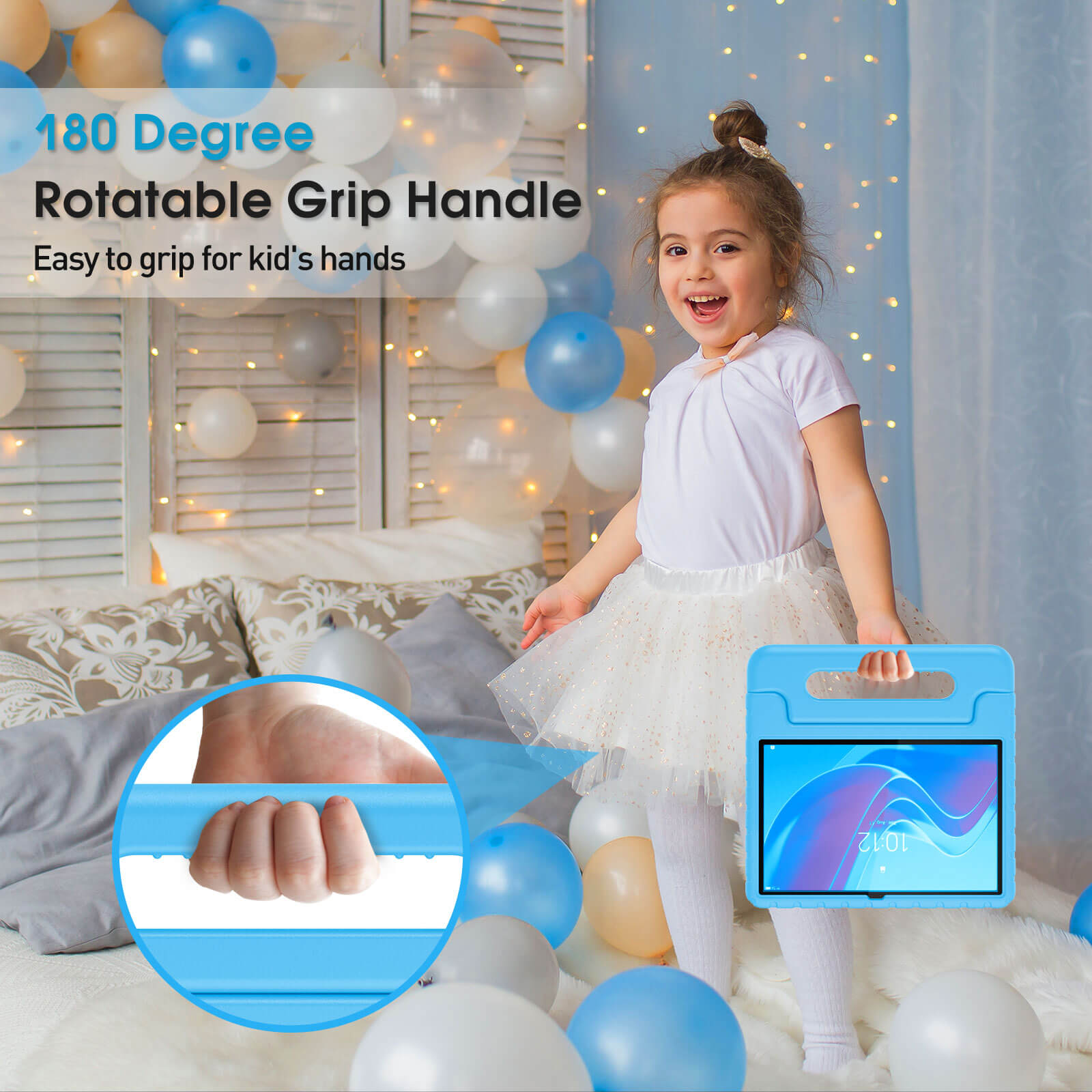 - Portable and Convenient: 180° rotatable grip handle is easy to carry around; Fold it back into a stand with dual angles for watching movies or drawing