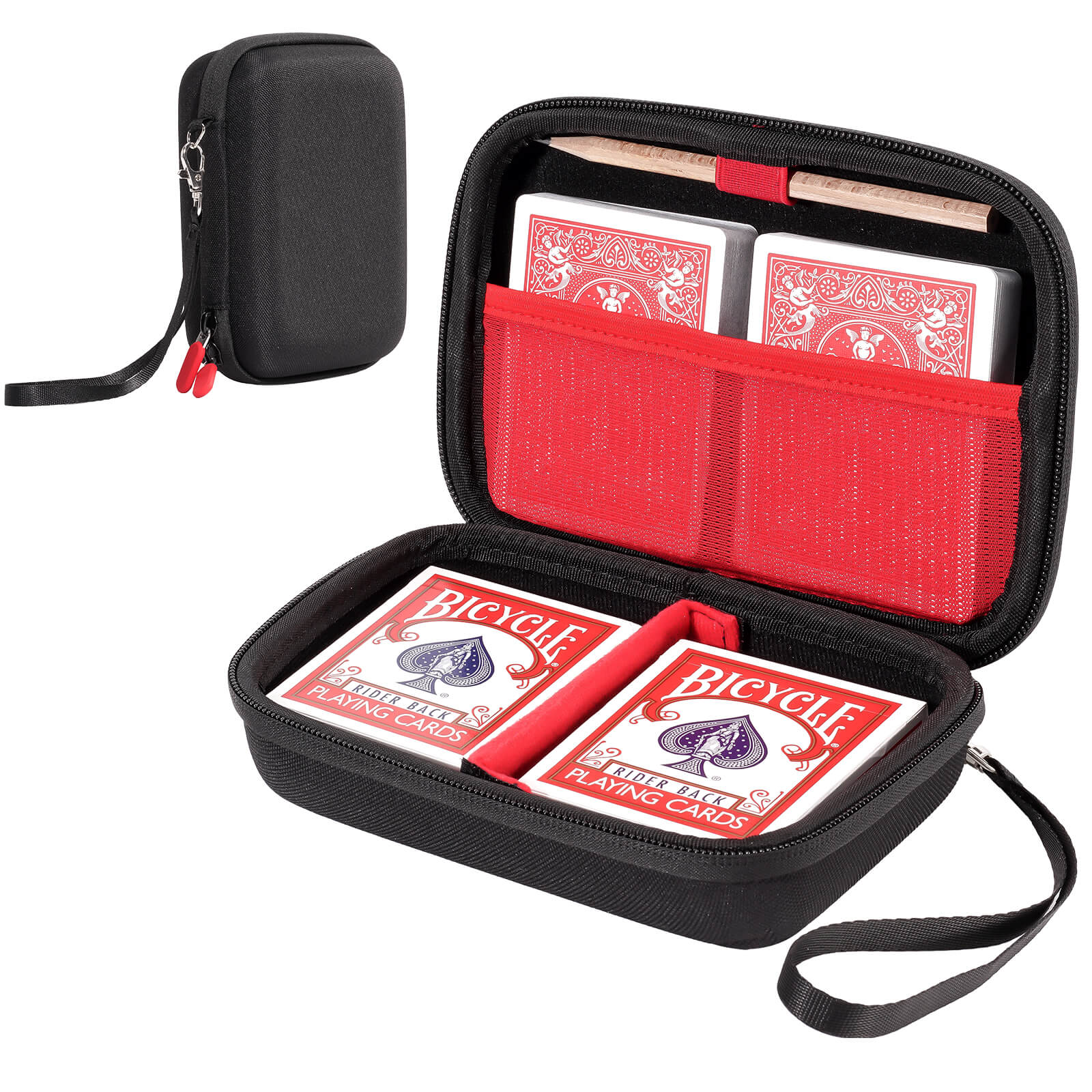 - The interior is thoughtfully designed with a mesh pocket and a removable divider secured by hook-and-loop closure. These compartments allow you to separate different decks or game types, keeping everything neatly arranged in one compact space. This makes the Hard Travel Playing Card Game Case both practical and easy to use.